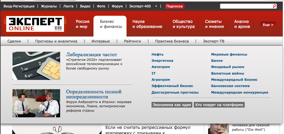 При наведении курсора на пункт основного меню (на красной плашке) вниз выпадает строчка подуровня. Через пару секунд из нее выпадает вторая плашка с анонсами по этому подуровню.
