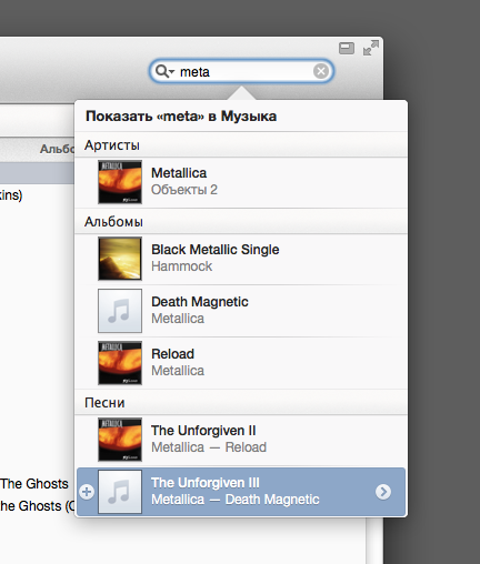 Если в выпадайке поиска музыки в Айтюнсе тыкнуть на композицию, выпадайка не исчезнет сразу. Выбранный элемент будет отмечен и запустится музыка. Можно передумать и тыкнуть другую.